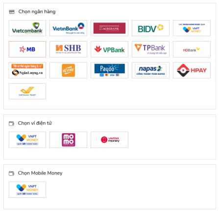 - Danh sách các kênh thanh toán (ngân hàng, ví điện tử...)