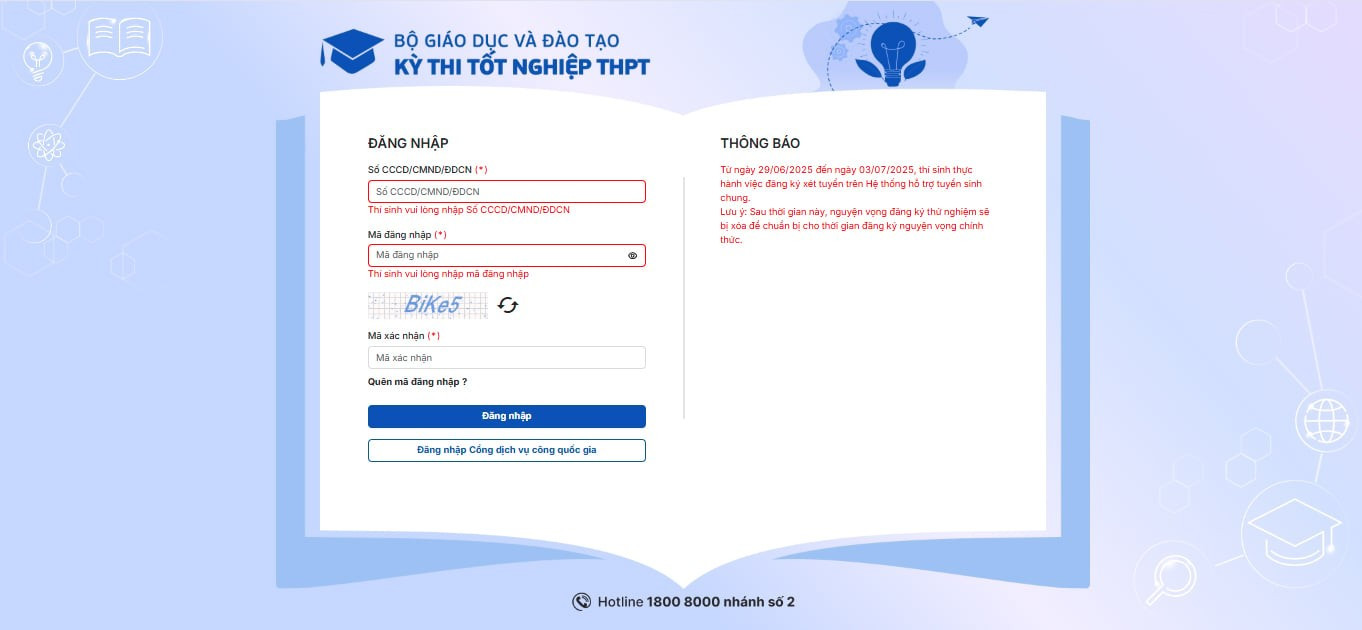 Thí sinh truy cập địa chỉ: http://thisinh.thitotnghiepthpt.edu.vn và tiến hành đăng nhập bằng: