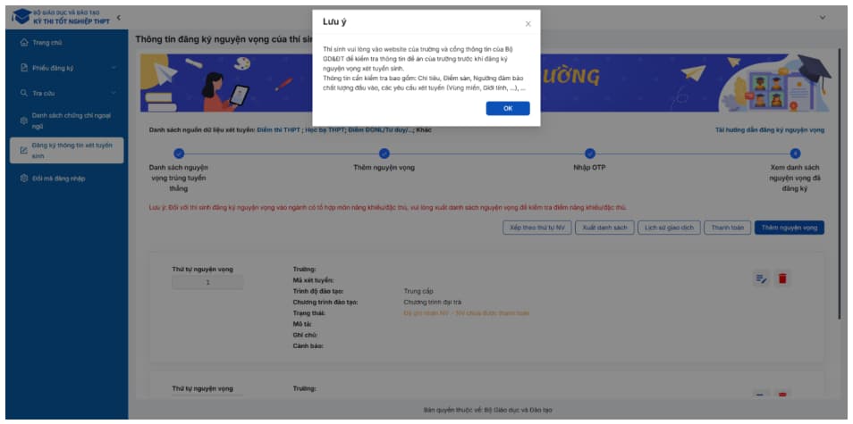 - Chỉ thực hiện thanh toán trực tiếp trên Cổng thông tin của Bộ GD&ĐT, không chuyển khoản ngoài hệ thống.