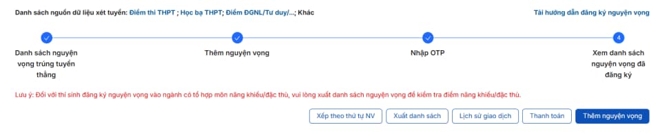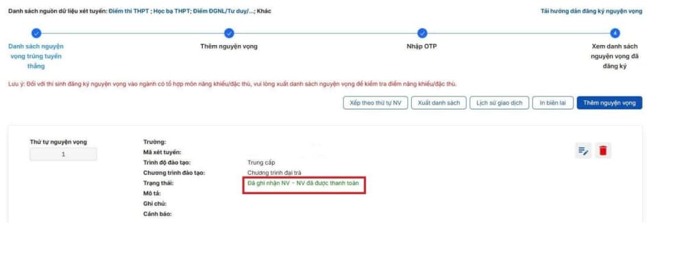 Sau khi thanh toán thành công, hệ thống sẽ tự động quay về trang ban đầu. Thí sinh đăng nhập lại (nếu cần) và vào mục Danh sách nguyện vọng để kiểm tra trạng thái.