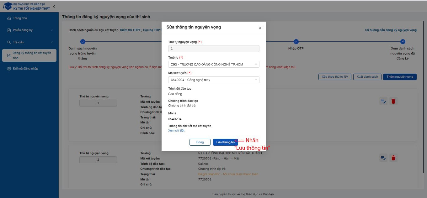 Bước 2: Chỉnh thông tin nguyện vọng → nhấn Lưu thông tin.