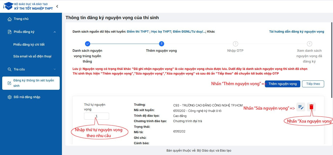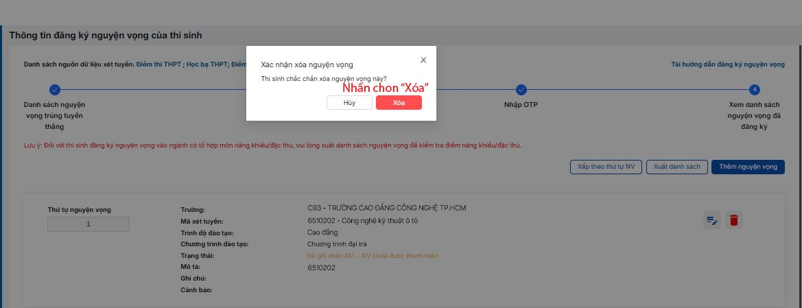 Vào “Xem danh sách nguyện vọng đã đăng ký” → chọn Xóa tại nguyện vọng cần bỏ.