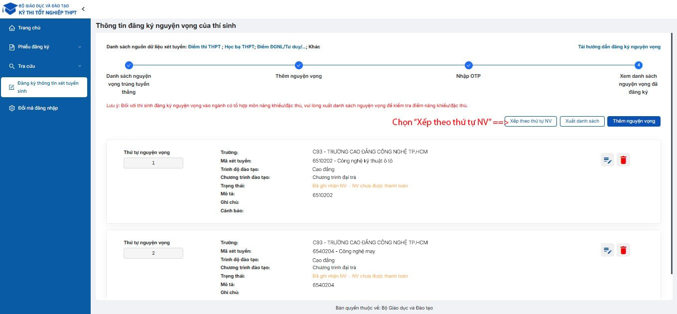 Vào “Xem danh sách nguyện vọng đã đăng ký” → chọn Xếp theo thứ tự nguyện vọng.