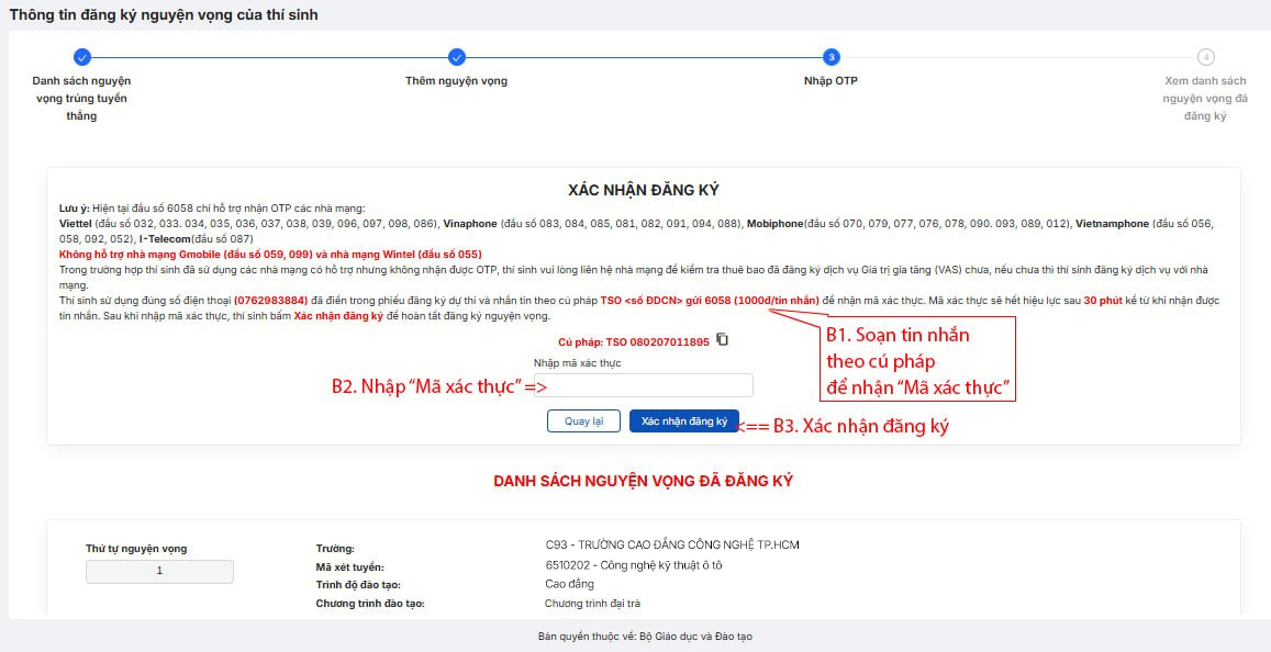 Trong quá trình thao tác, nếu gặp khó khăn, thí sinh và phụ huynh vui lòng liên hệ Phòng Tuyển sinh – Công tác HSSV, Trường Cao đẳng Công nghệ TP.HCM để được hướng dẫn kịp thời, tránh sai sót đáng tiếc.