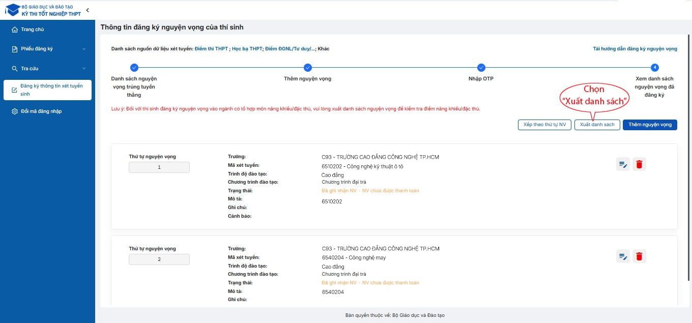 Tại “Xem danh sách nguyện vọng đã đăng ký”, thí sinh nhấn Xuất danh sách để tải file về lưu trữ.