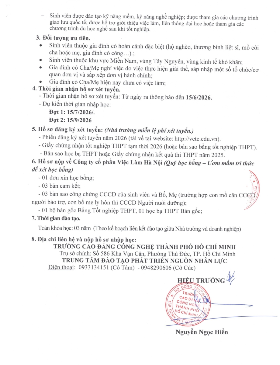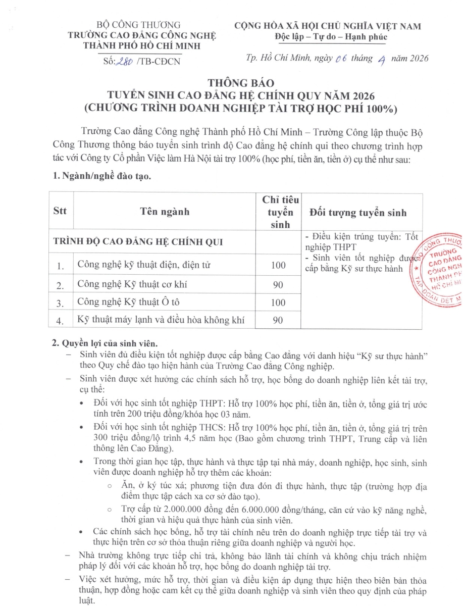 THÔNG BÁO TUYỂN SINH CAO ĐẲNG CHÍNH QUY NĂM 2026 (CHƯƠNG TRÌNH DOANH NGHIỆP TÀI TRỢ HỌC PHÍ 100%)
