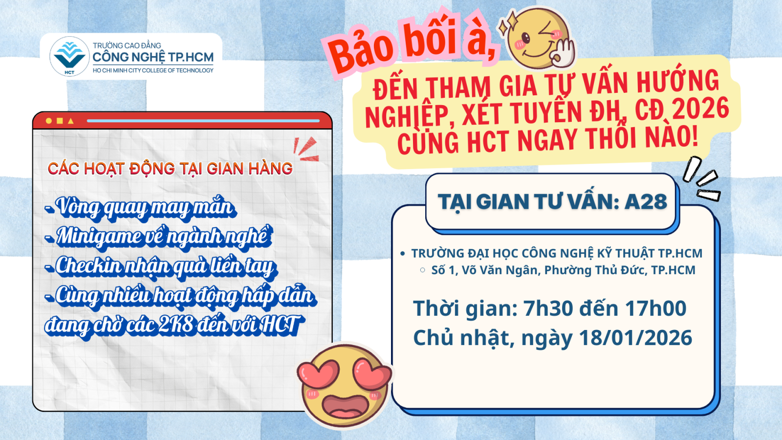 “BẢO BỐI ƠI, GHÉ GIAN A28 CÙNG HCT THUI NÀO!” – TRƯỜNG CAO ĐẲNG CÔNG NGHỆ TP.HCM THAM GIA NGÀY HỘI TƯ VẤN HƯỚNG NGHIỆP – XÉT TUYỂN ĐH, CĐ 2026